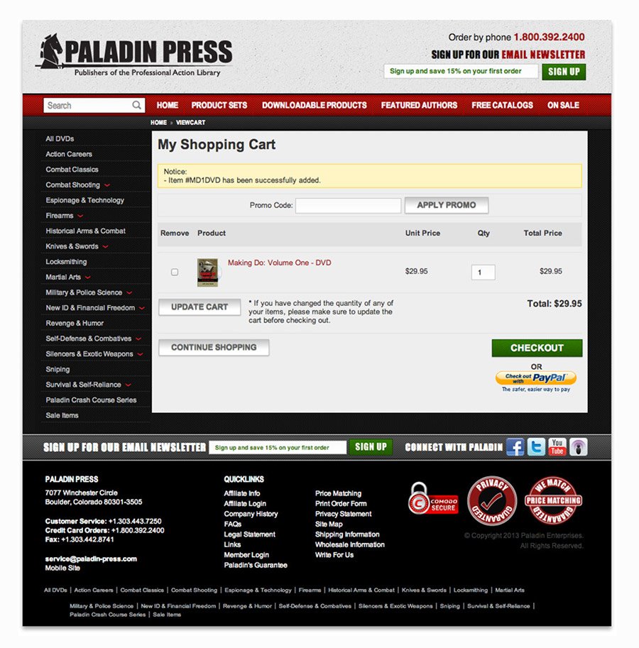 During my time at Paladin Press we refreshed the website to modernize the look and feel of the brand. We upgraded our eCommerce platform to align more closely with Amazon sales, as Amazon became our largest customer. This included adding features like "buy now."